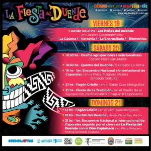 Para el domingo 21 de noviembre el Fogón Criollo del mediodía desde las 12 horas, el colorido desfile del Duende a las 19 horas, por las calles coscoínas, donde grandes y chicos llevaron la algarabía con sus máscaras, llenando de colorido y de música para ahuyentar los males y recibir de brazos abiertos la dicha próxima. Y a las 21 el Dúo Coplanacu cerró la fiesta popular con una gran presentación en la Plaza Próspero Molina con entrada gratuita.